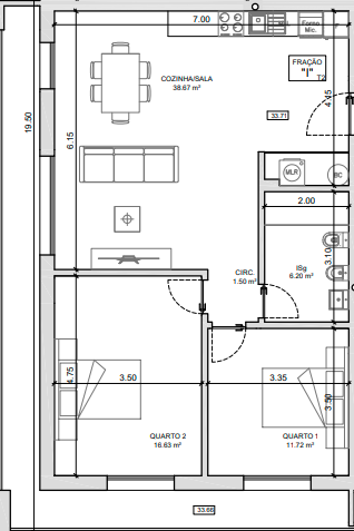 Na zona privada, o imóvel dispõe de dois quartos com roupeiros embutidos e uma casa de banho. O apartamento conta ainda com ar condicionado na sala e num dos quartos, estando o segundo quarto já preparado para futura instalação.